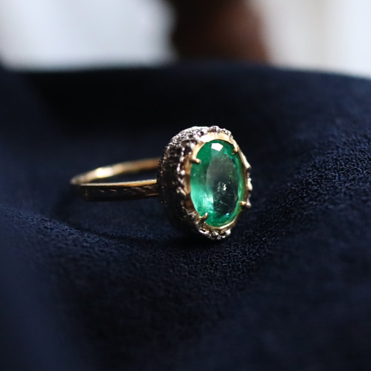広めのテーブル面を囲むように、繊細なファセットが施されたエメラルド。