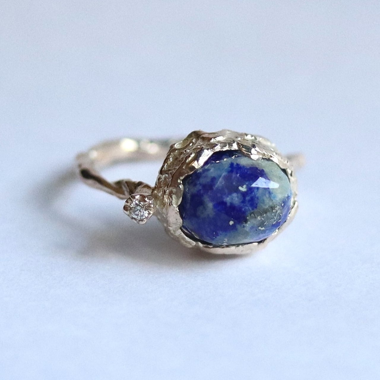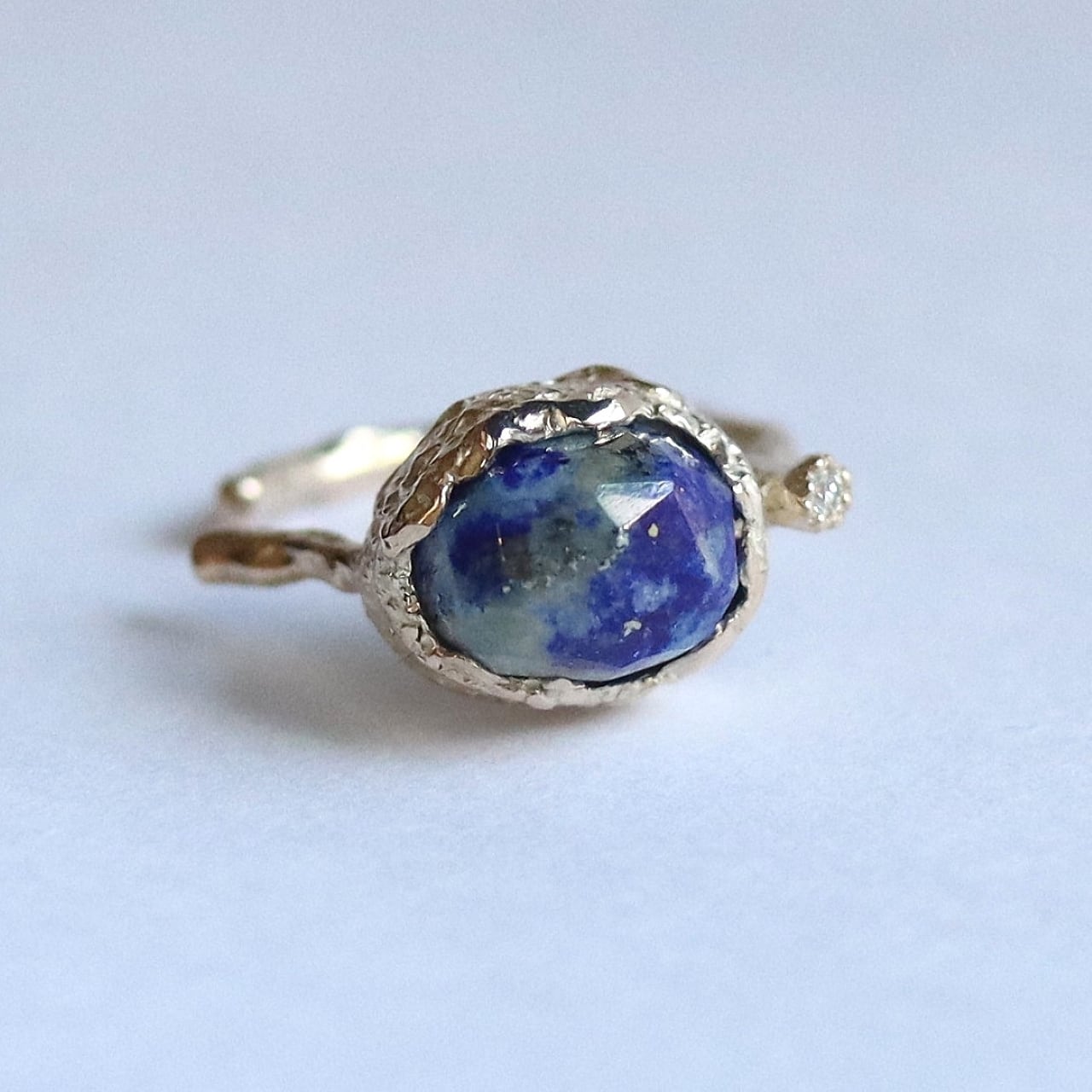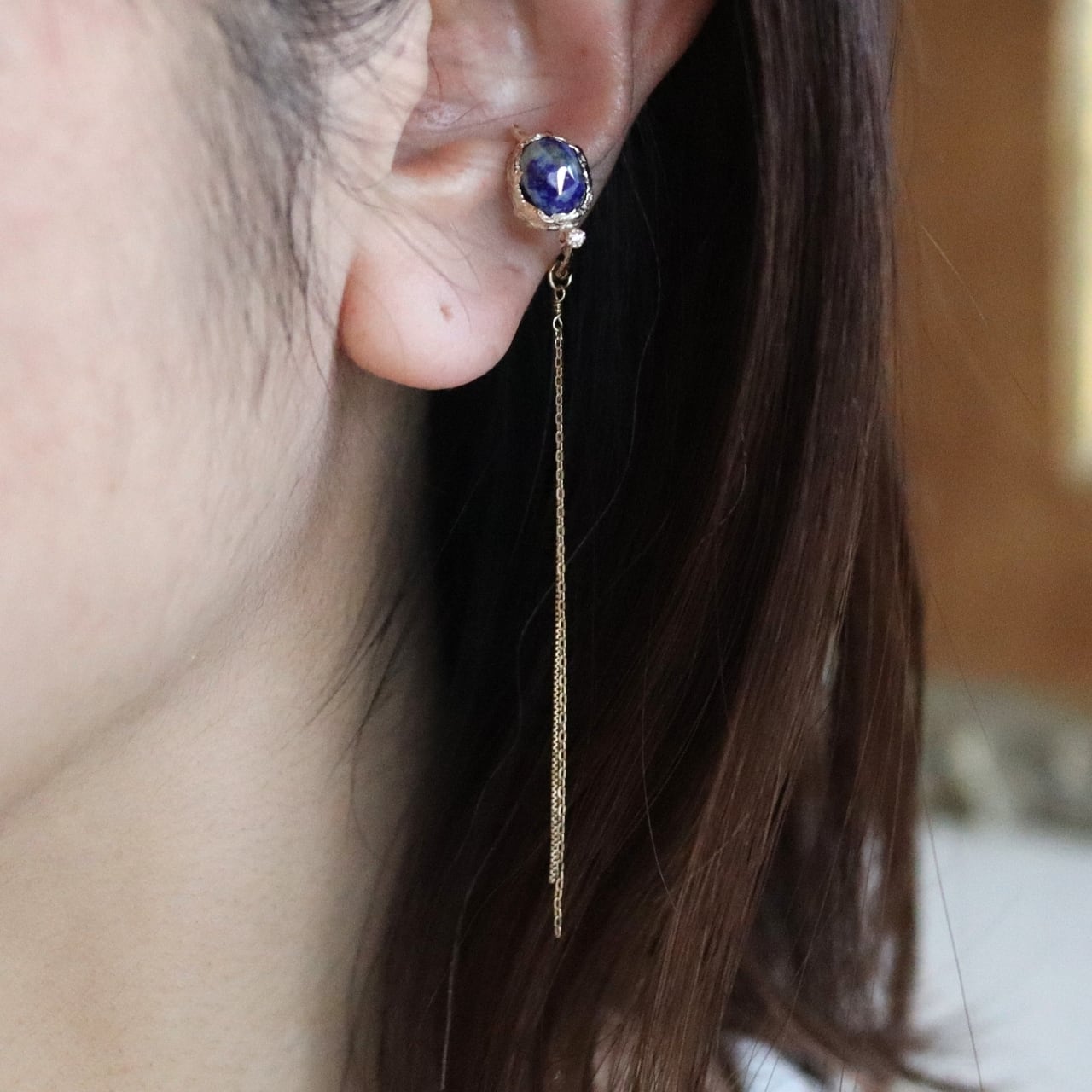ラピスラズリは、手擦りで仕上げた一点物のオリジナルカット。ひとつの石の中に、深みを湛えた青とカルサイトが交じり合い、繊細なパイライトがほのかに光を宿します。