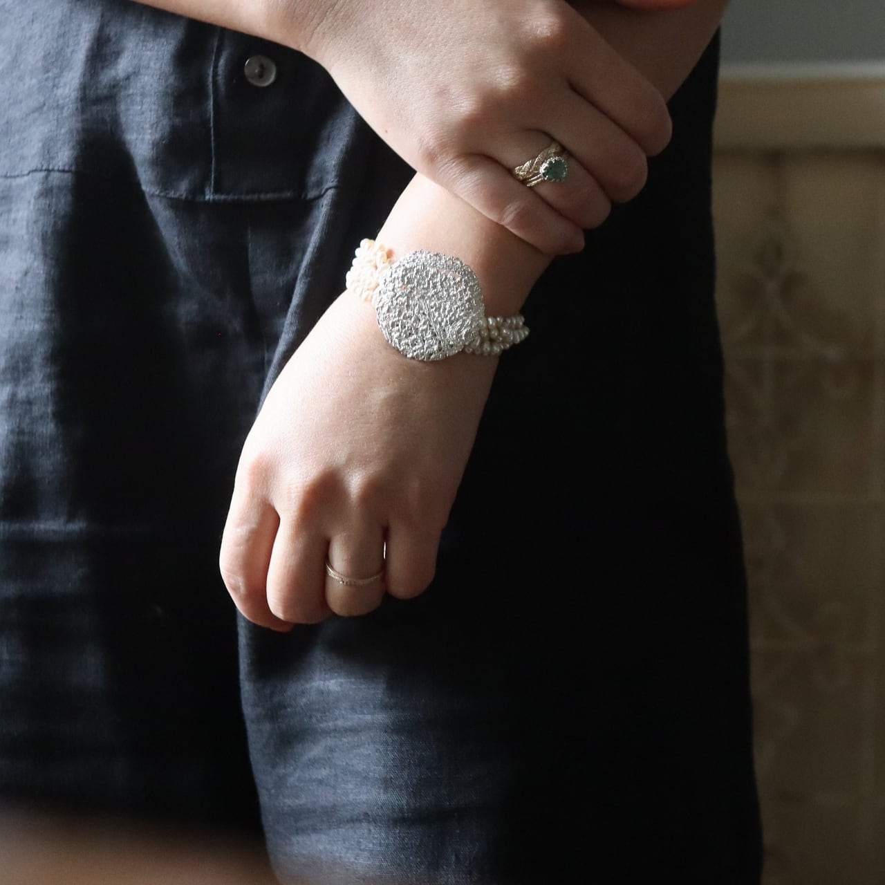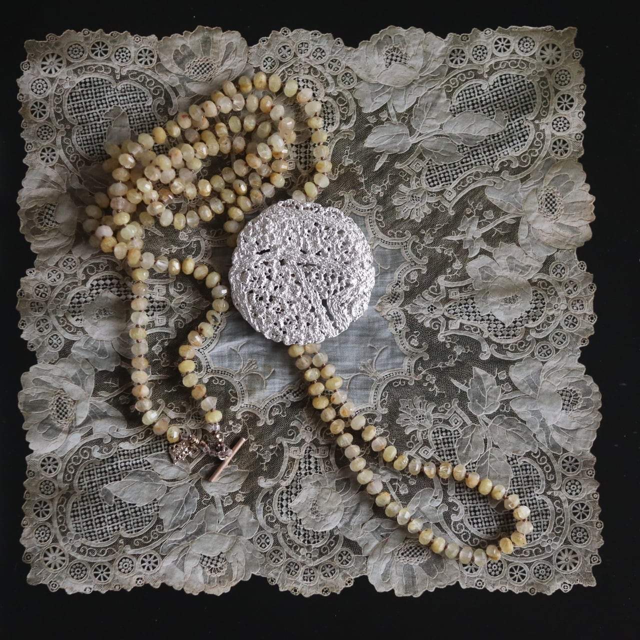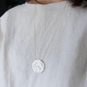シンプルなファッションを引き立てる、大判のレースが印象的な